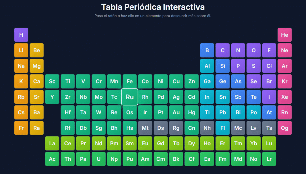 La tabla periódica cobra vida. Explora las familias de elementos y descubre patrones ocultos en sus propiedades con solo un clic.